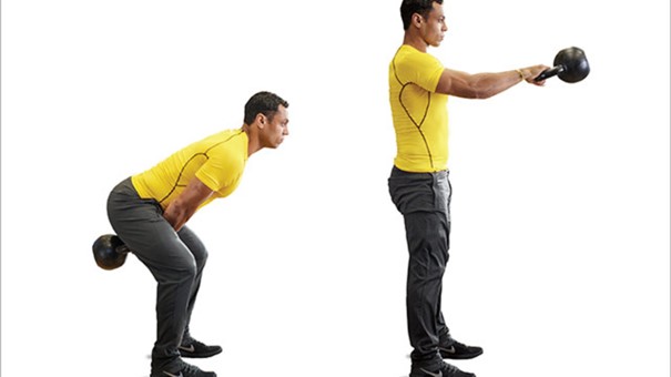 Postavíme se nad kettlebell a uchopíme ho na zemi mezi nohama. Tělo máme v předklonu a hřbet je rovný. Pohodíme kettlebell krátkým pohybem mezi nohy za sebe a pak se jím silným pohybem zaženeme směrem dopředu do úrovně hrudníku, přičemž ruku s kettlebellem držíme stále vyrovnanou. Pohyb končí vztažením se v pase, kolenou a kotnících. Vrátíme se do původní polohy.